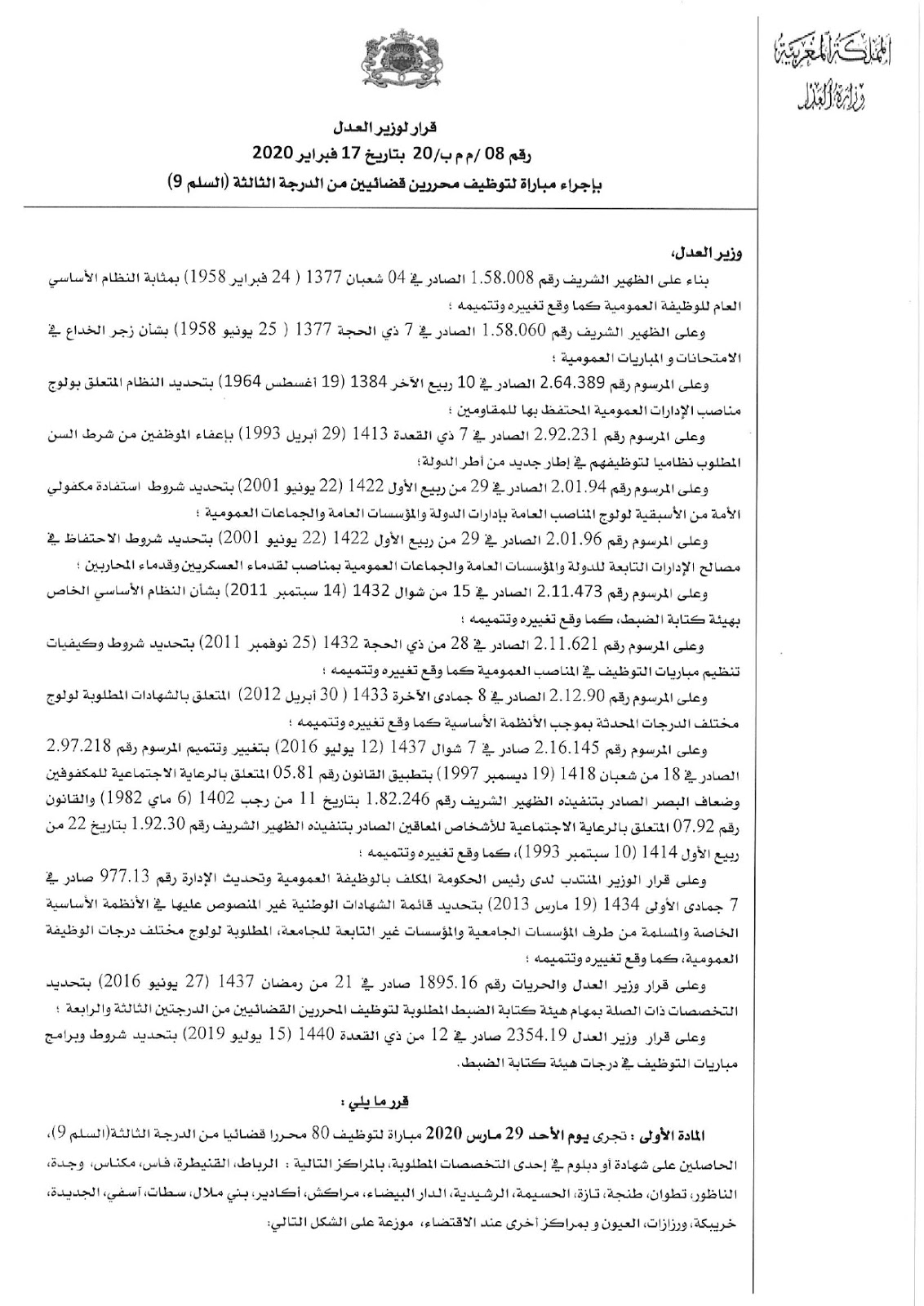 وزارة العدل مباراة توظيف 80 محرر قضائي من الدرجة الثالثة آخر أجل 06 مارس 2020