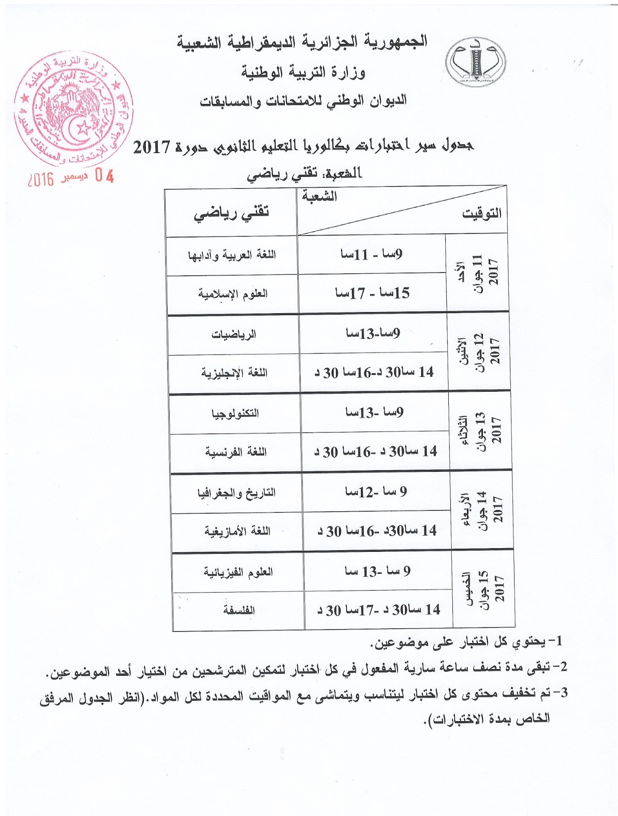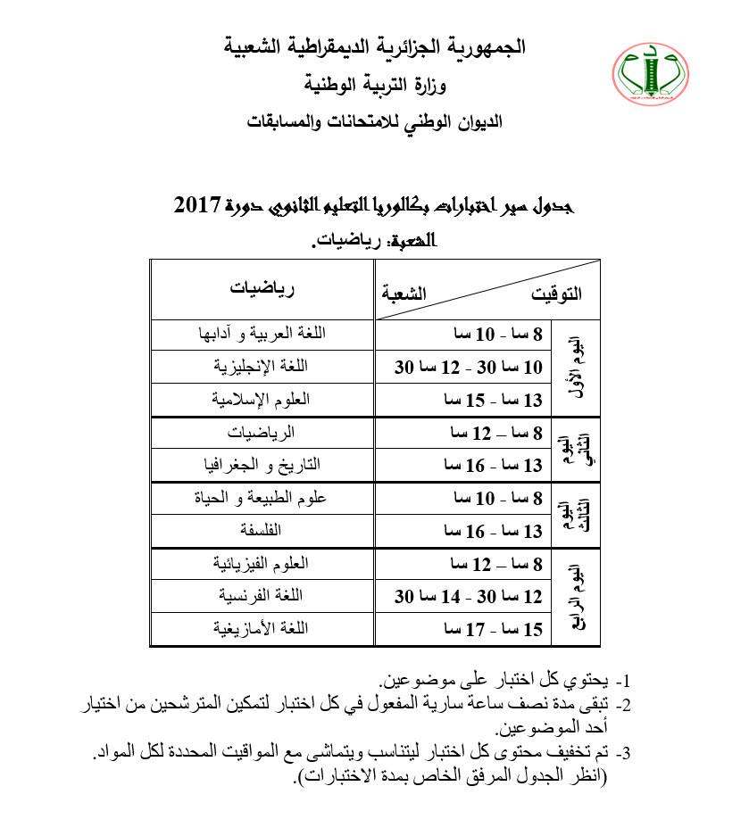 مدونة التربية والتعليم الجزائرية توقيت وجدول سير بكالوريا 2017 شعبة رياضيات