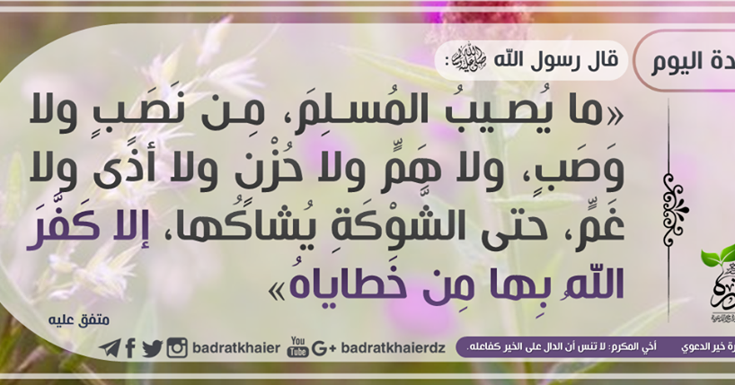 فى واحة القرآن والسنة ما ي ص يب الم س ل م م ن ن ص ب ول ا وص ب ول ا ه م ول ا ح ز ن ول ا أذ ى ول ا غ م حت ى الش و ك ة ي ش اك ه ا إل ا ك ف ر الل ه به ا م ن خ ط اي اه الراوي أبو