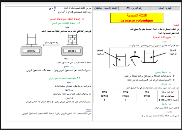 درس الكتلة الحجمية مادة الفيزياء والكيمياء للسنة الأولى إعدادي الدراسة