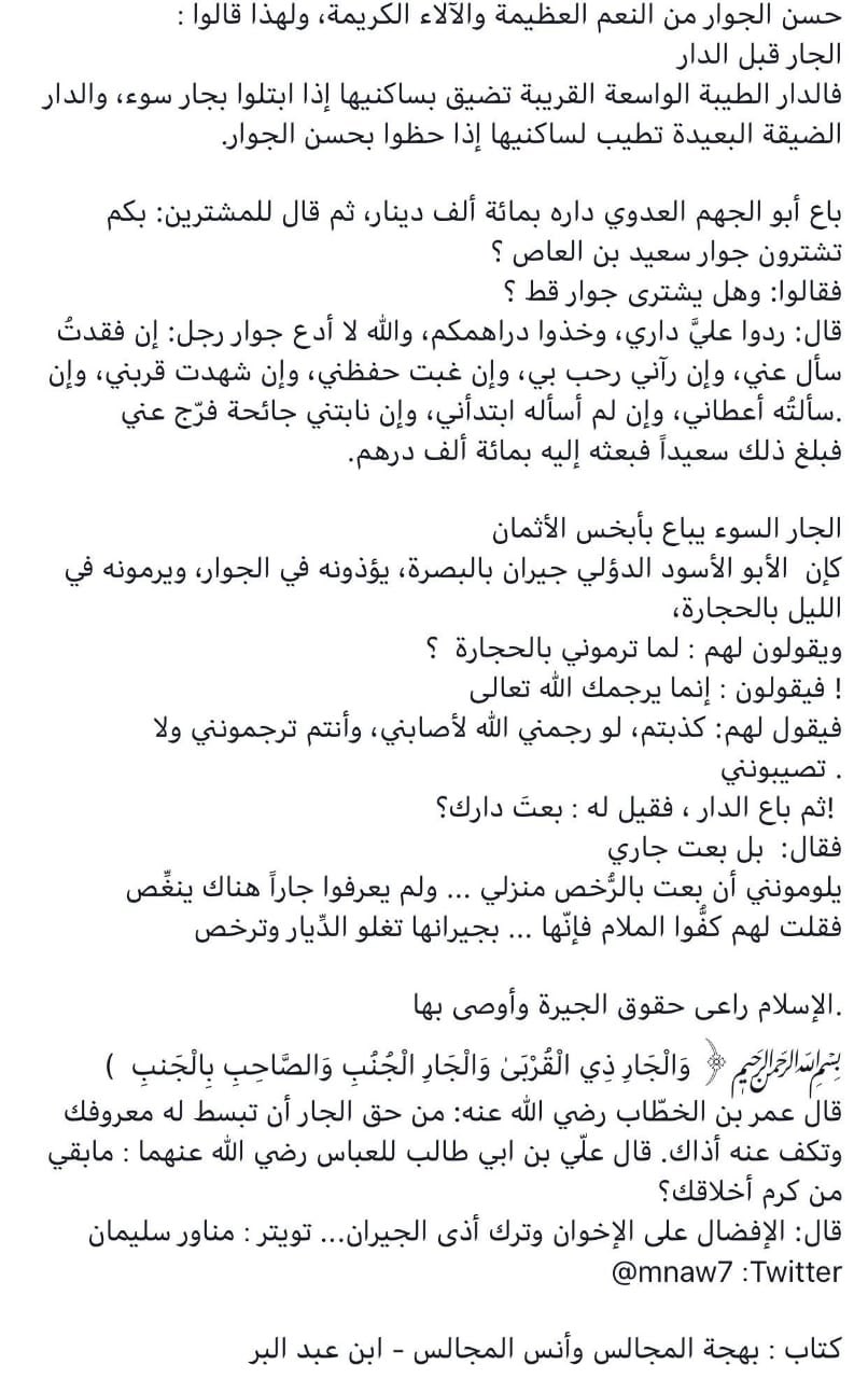 مناور سليمان En Twitter حسن الجوار من النعم العظيمة والآلاء الكريمة ولهذا قالوا الجار قبل الدار باع أبو الجهم العدوي داره ثم قال للمشترين بكم تشترون