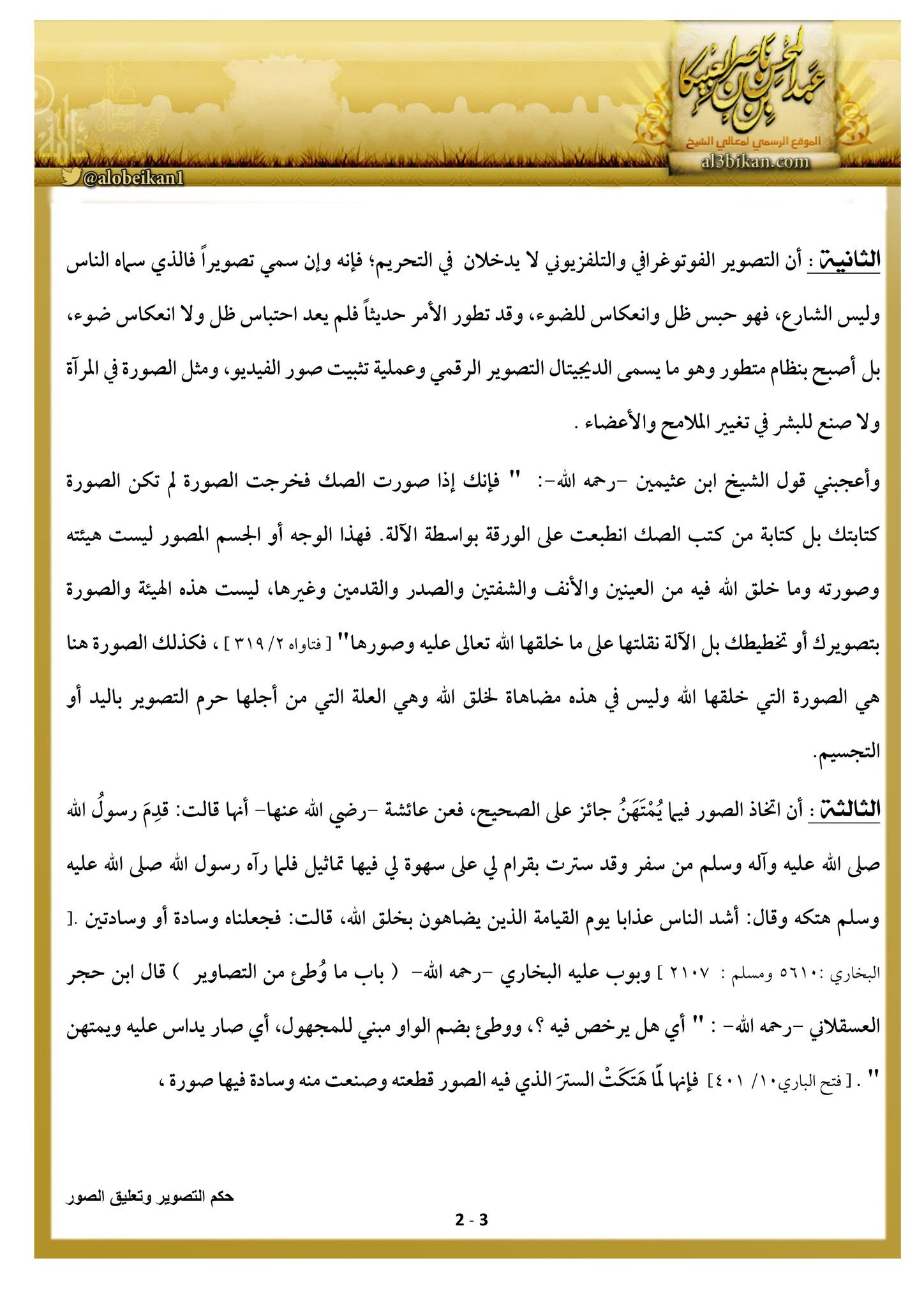 ما حكم التصوير وكيف يفعل من ط لب منه التصوير في الامتحان وما حكم مشاهدة الصور التي في المجلات والتلفزيون. ما قولكم في حكم التصوير الذي قد عمت به البلوى وانهمك فيه الناس تفضلوا بالجواب الشافي عما يحل منه وما يحرم. حكم التصوير بالكاميرا والفيديو والهاتف سؤالي حول موضوع التصوير فقد حرم كبار العلماء موضوع رسم ذوات الأرواح لأن فيه مضاهاة لخلق الله و حرم البعض أيضا التقاط صور الأرواح باستخدام الكاميرا والهاتف الجوال في حين أننا.
