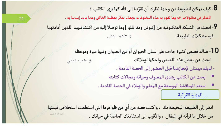 حل درس الطبيعة مدرسة دائمة للصف العاشر في اللغة العربية الفصل الثالث