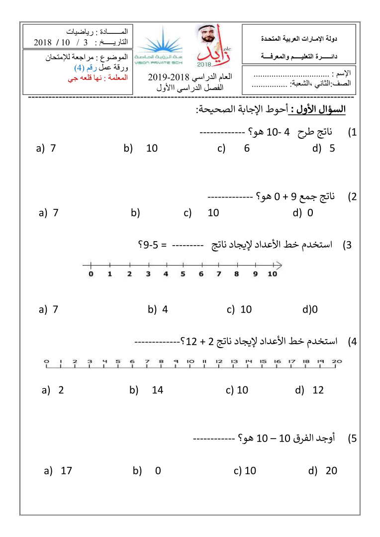 أوراق عمل حول استخدام خط الأعداد في الجمع الصف الأول رياضيات الفصل الثاني 2018 2019 المناهج الإماراتية