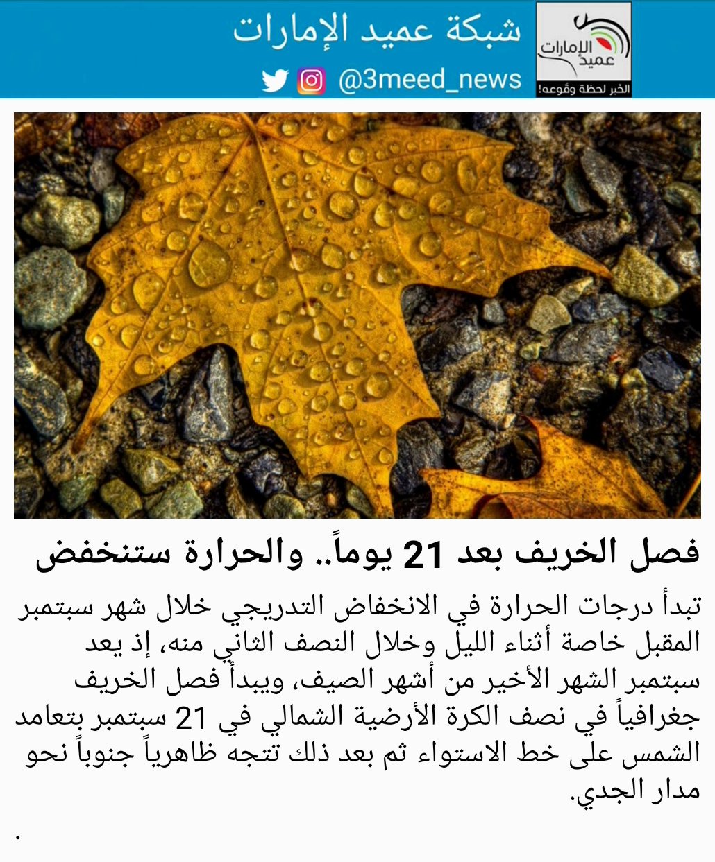 شبكة عميد الإمارات On Twitter أكد المركز الوطني للأرصاد الجوية والزلازل أن شهر سبتمبر الجاري يعتبر آخر الشهور الصيفية التي تبدأ فيها درجات الحرارة Https T Co M3qqnmfjfs