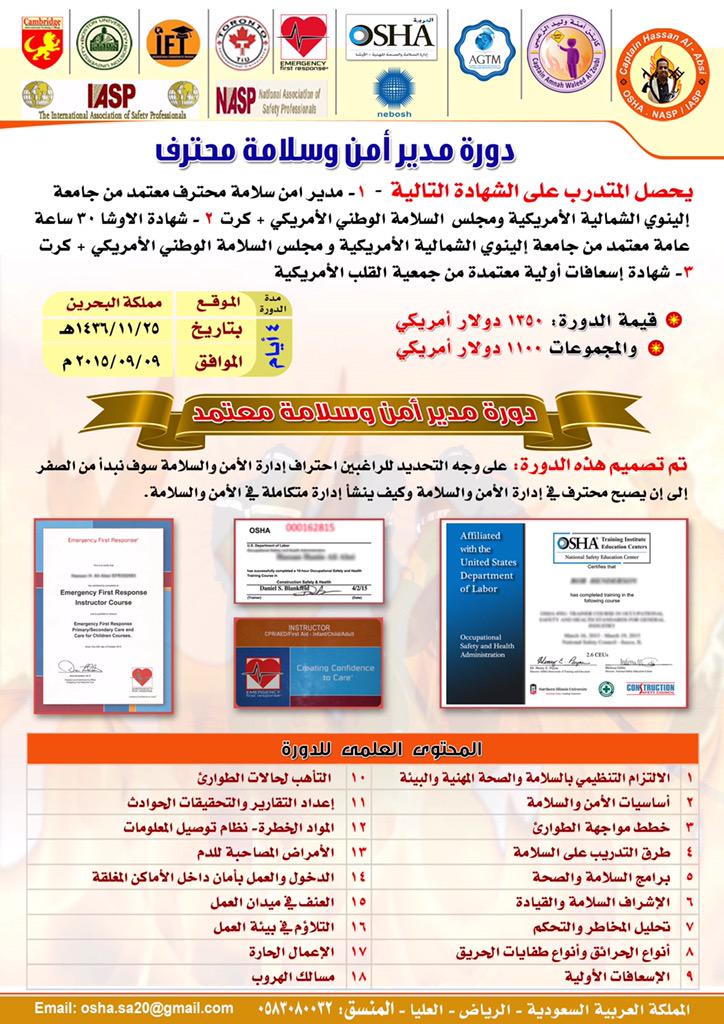 Uzivatel مركز آد للتدريب Na Twitteru دورة السلامة والصحة المهنية الدورة تؤهلك لتصبح مدير أمن وسلامة دورات الرياض السعودية آد للتدريب للاستفسار 0541224911 Https T Co Wsd5umebao